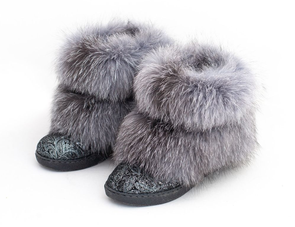 Зимние женские сапожки "угги". Материал верха - натуральная замша с лазерной обрабокой, декор - натуральный мех серебристо-черной лисы или пыжей лисы. Внутренний утеплитель - натуральный мех овчины.