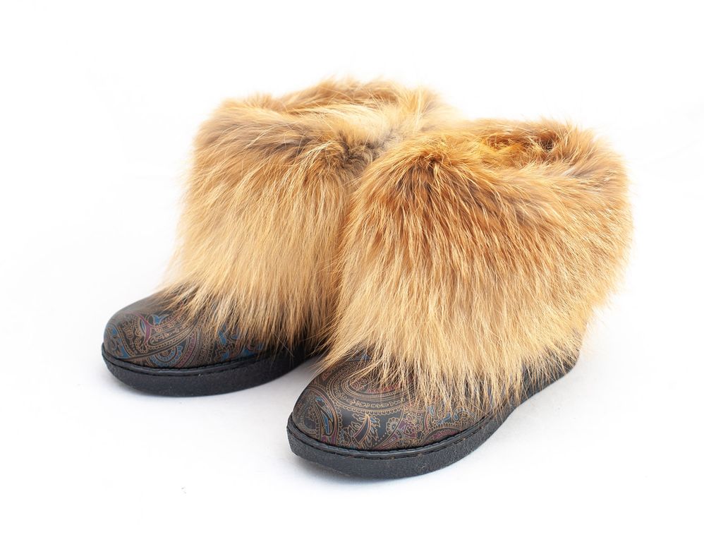 Зимние женские сапожки "угги". Материал верха - натуральная замша с лазерной обрабокой, декор - натуральный мех серебристо-черной лисы или пыжей лисы. Внутренний утеплитель - натуральный мех овчины.