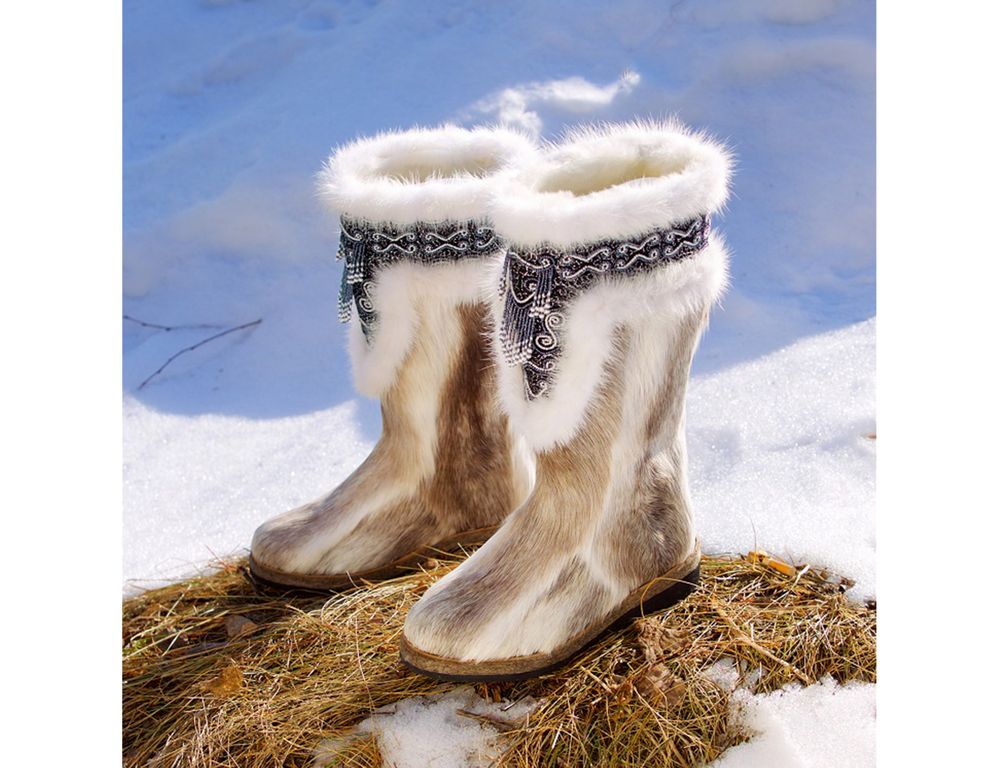 Унты женские, камус северного оленя, отделка бисером и норкой