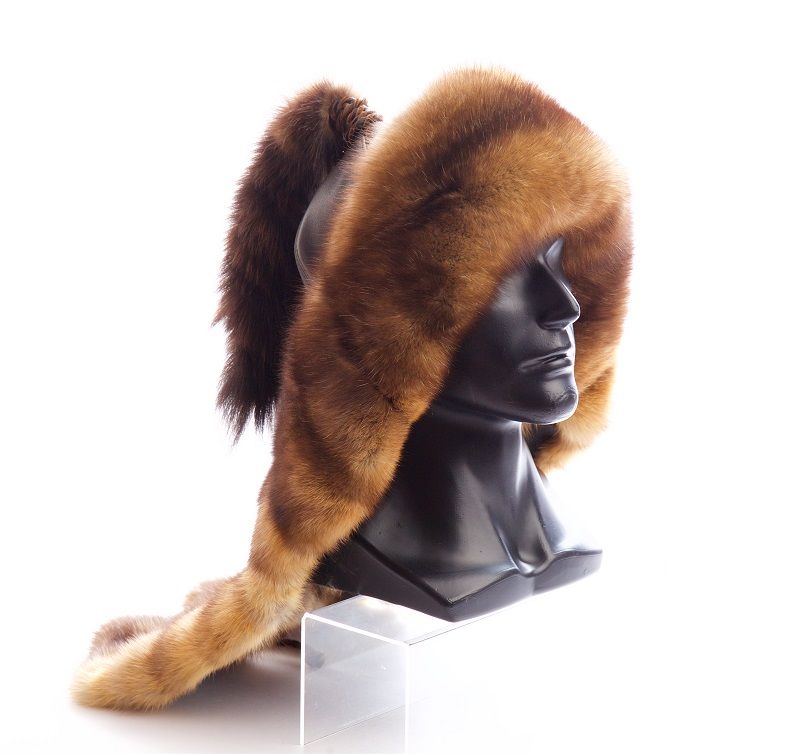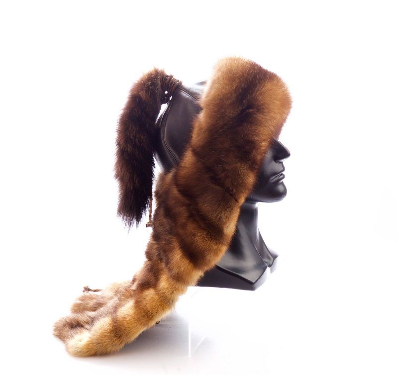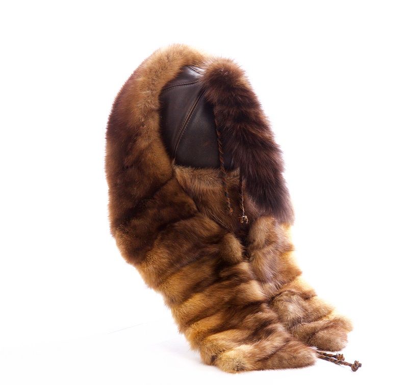 Эксклюзивная шапка из меха соболя, комбинированная натуральной кожей, декорирована хвостом соболя. Эта модель выполнена в единственном экземпляре, является копией головных уборов древних татаро-монгольских кочевников (аналог представлен в х/ф "Тобол").