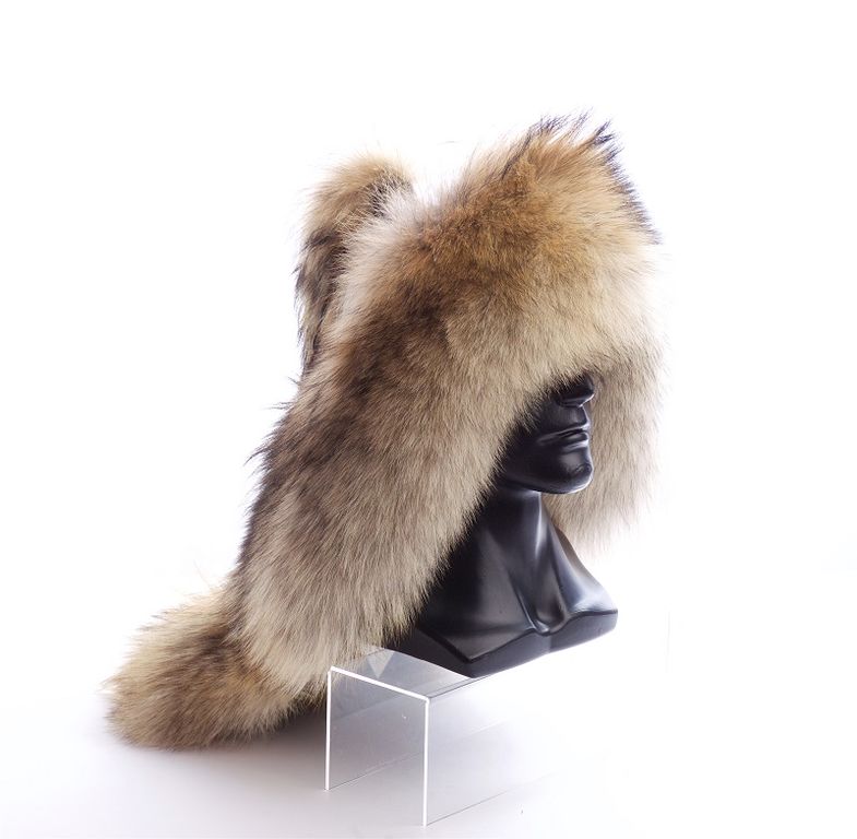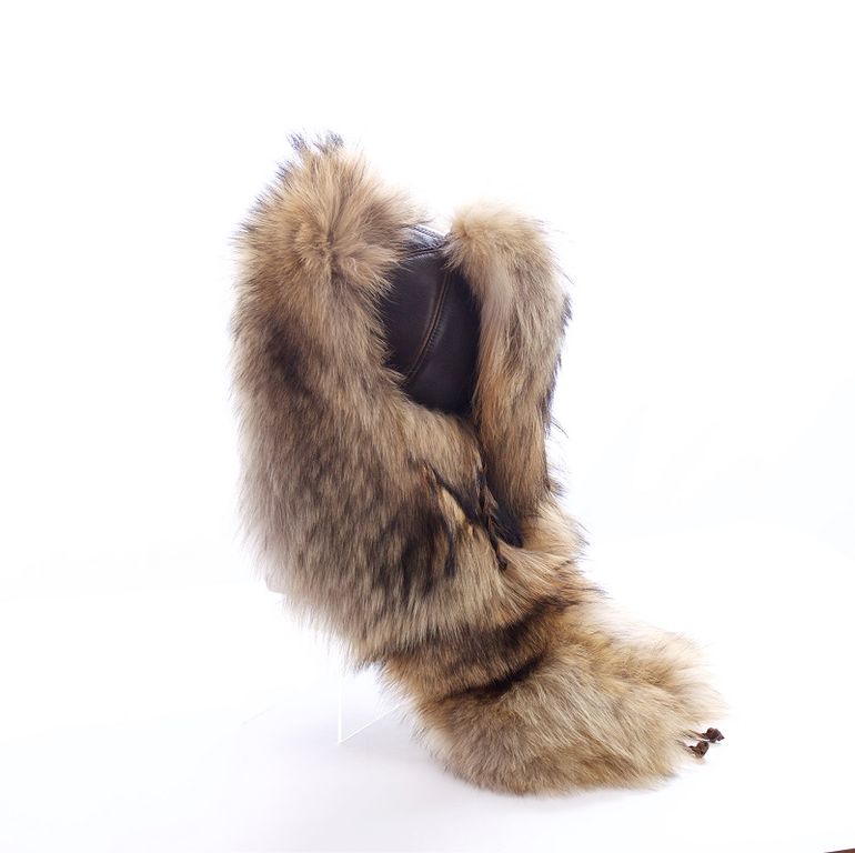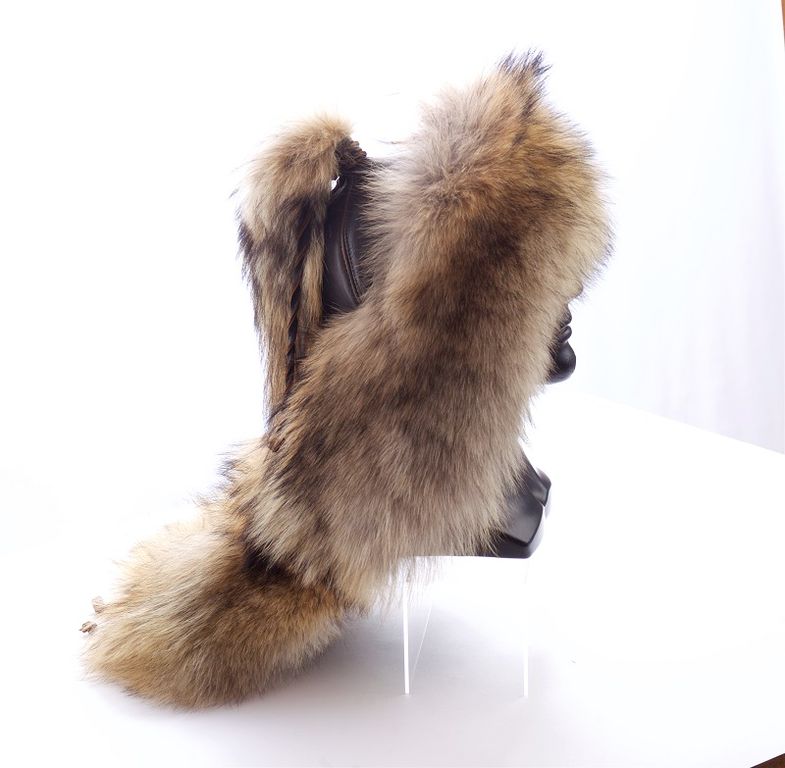 Эксклюзивная шапка из полярного волка, комбинированная натуральной кожей, декорирована волчьим хвостом. Эта модель выполнена в единственном экземпляре, является копией головных уборов древних татаро-монгольских кочевников (аналог представлен в х/ф "Тобол").