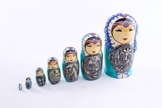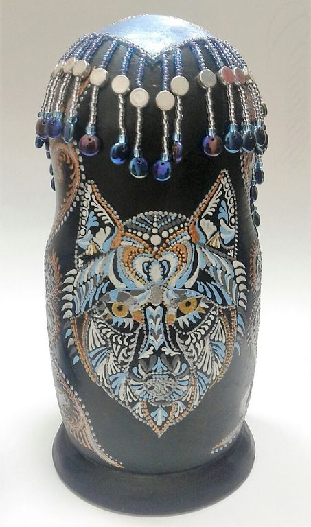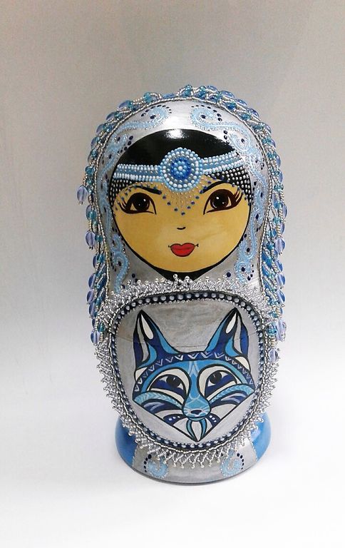 красками в технике точечной росписи. Каждая матрешка расписана мастером в единственном экземпляре,