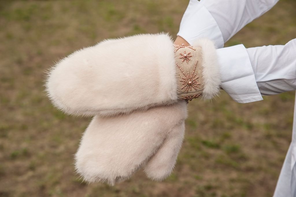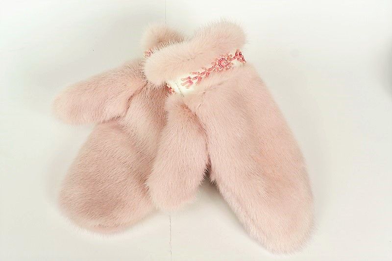 Данные рукавицы выполнены из цельного меха норки, отделка - вышивка бисером.