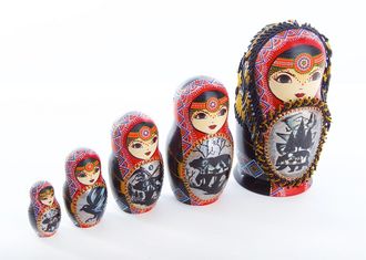 красками в технике точечной росписи. Каждая матрешка расписана мастером в единственном экземпляре,
