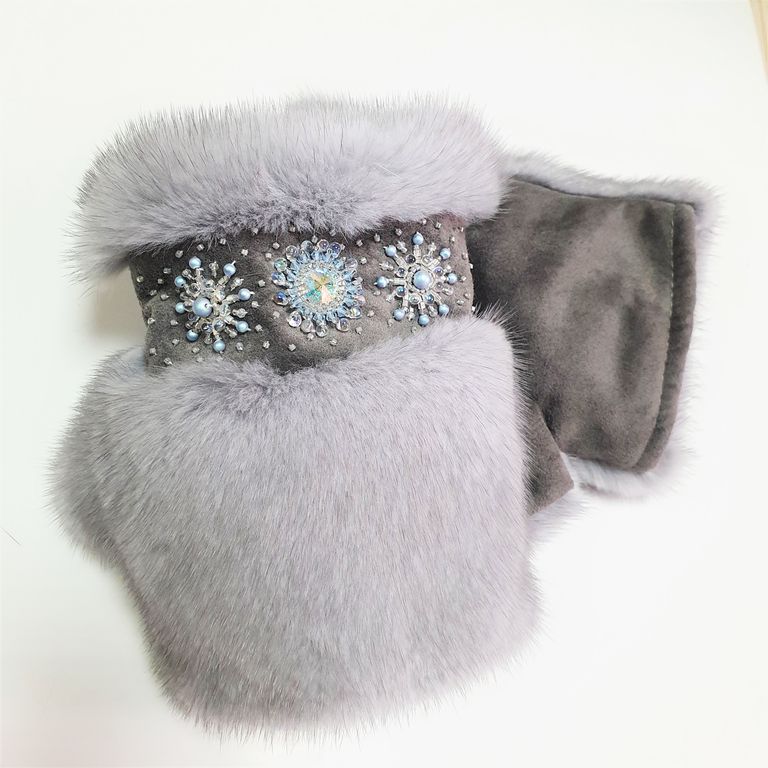 Митенки из меха норки "Сапфир" с натуральной замшей и вышивкой "Сваровски" Люкс
